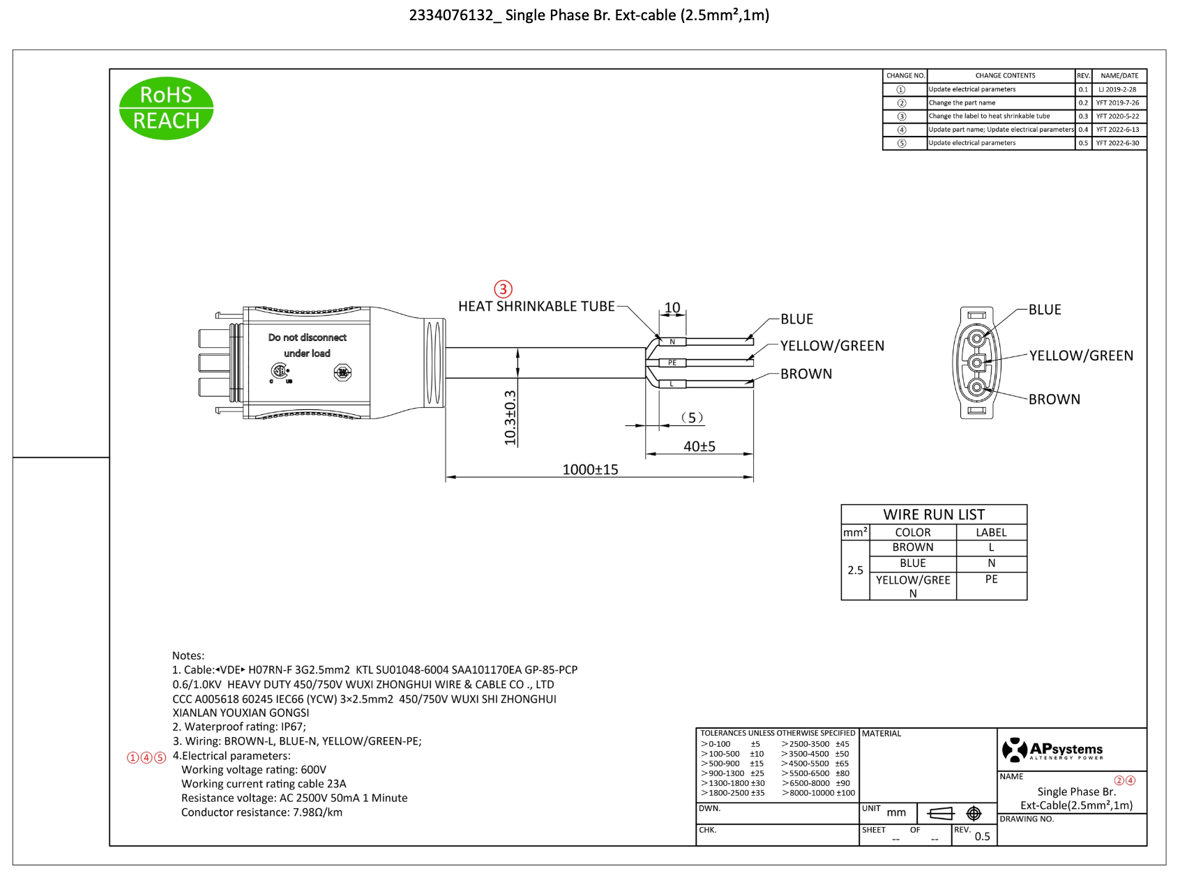 Złącze jest o długości 1 metra - przedłużacz, z jednej strony posiadający hermetyczny wtyk AC przeznaczony do podłączenia z gniazdem mikroinwertera APsystems, a z drugiej strony zakończony jest 3 przewodami prądowymi, gotowymi do podłączenia z instalacją 230 V.