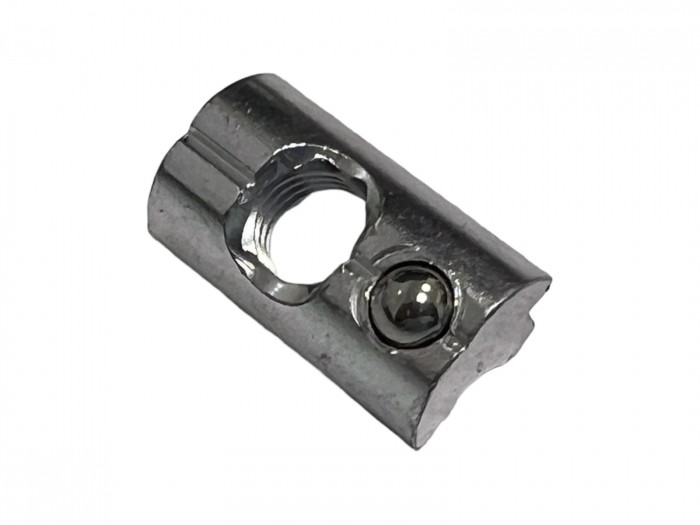 Wpust przesuwny z kulką M8 wykonany z aluminium, stosowany wraz ze śruba imbusową M8 do mocowania klem końcowych i środkowych przy montażu paneli fotowoltaicznych.