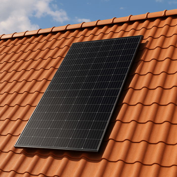 Czarna rama aluminiowa oraz biała folia elektroizolacyjna nadają panelowi elegancki wygląd i zapewniają doskonałą estetykę na dachu.
